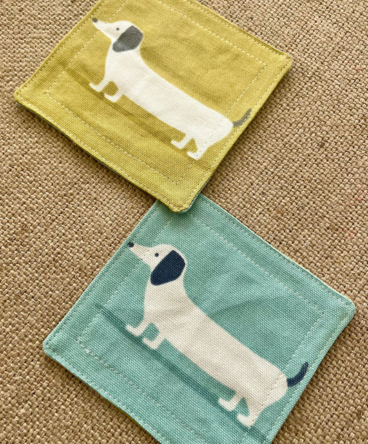 Dachshund Coasters x2 - Reversible Yellow & Blue Dog Print