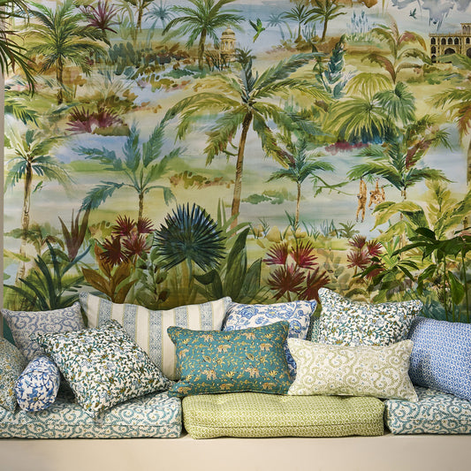 Blending heritage with a fresh perspective, the collection moves seamlessly from delicate motifs to more immersive designs. Hero fabric Kerala, painted by in-house designer Jessica Butler, captures the lush spirit of South India, complete with winding rivers, monkeys in the trees and distant mountains on the horizon.