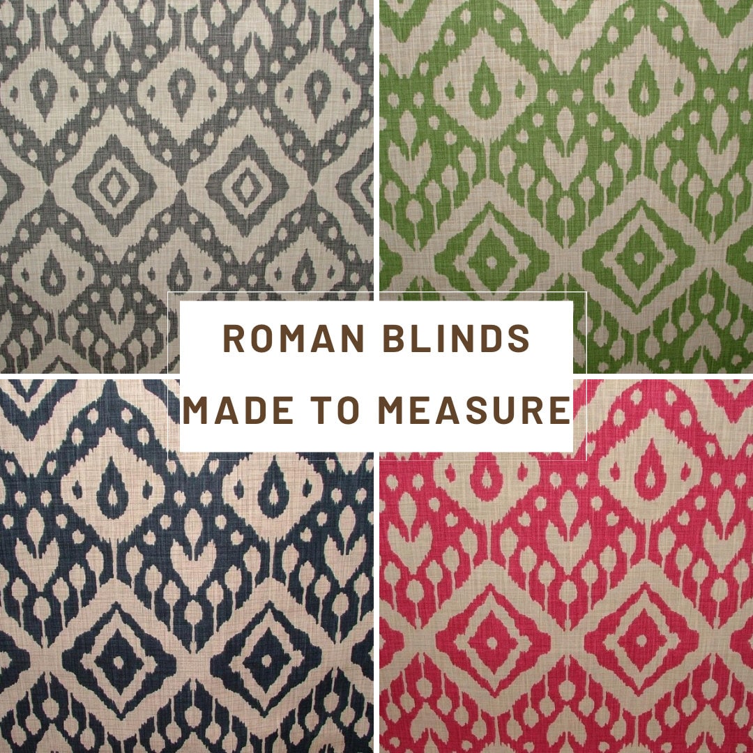 Discover our custom handmade Roman blinds in the modern bright Moroccan Ikat fabric, available in four stunning colour options—an ideal solution for both style and function!