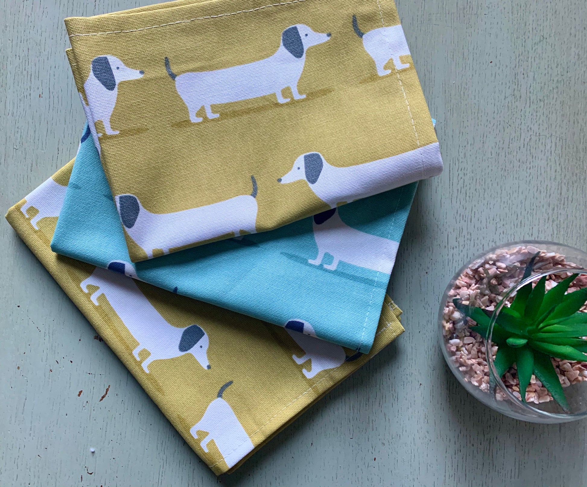 Elevate your kitchen decor with our charming handmade tea towels crafted from dachshund print cotton. Available in delightful yellow or calming blue, each towel adds a playful touch while maintaining high-quality functionality for your daily needs.