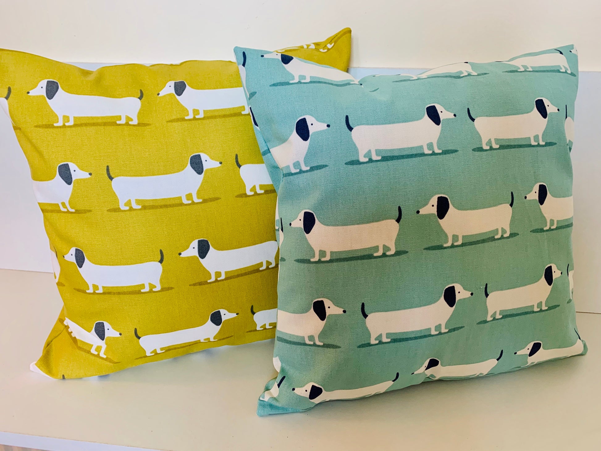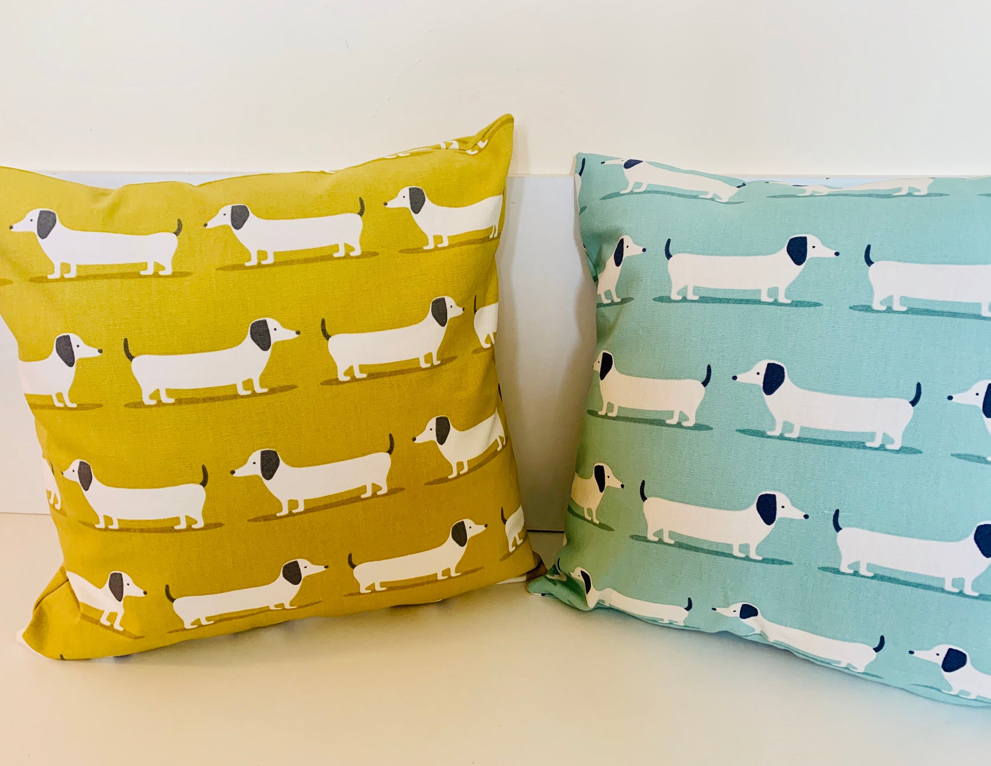 Dachshund Print Cushion Covers - Double-Sided, 16” Duck Egg Blue & Mustard Yellow